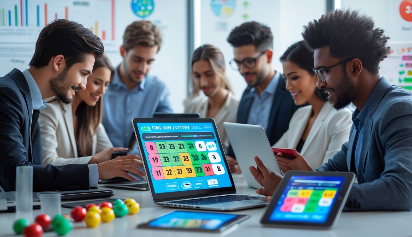 Sekelompok orang muda menggunakan perangkat digital di kantor modern dengan tampilan antarmuka lotre dan permainan judi online.