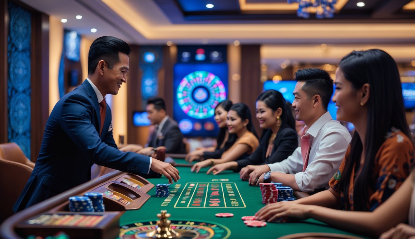 Suasana kasino langsung di Indonesia dengan dealer dan pemain yang sedang bermain di meja kasino.