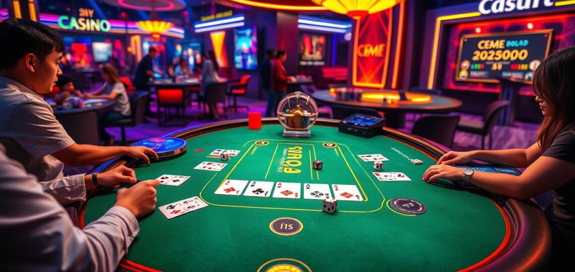Sebuah setup permainan kartu digital dengan layar menampilkan permainan Bandar Ceme 2D dan chip taruhan di atas meja.