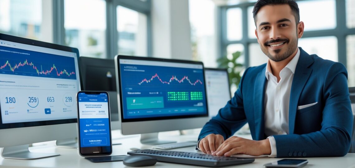 Seorang pebisnis percaya diri duduk di meja kantor modern dengan beberapa monitor komputer menampilkan grafik dan antarmuka transaksi aman.
